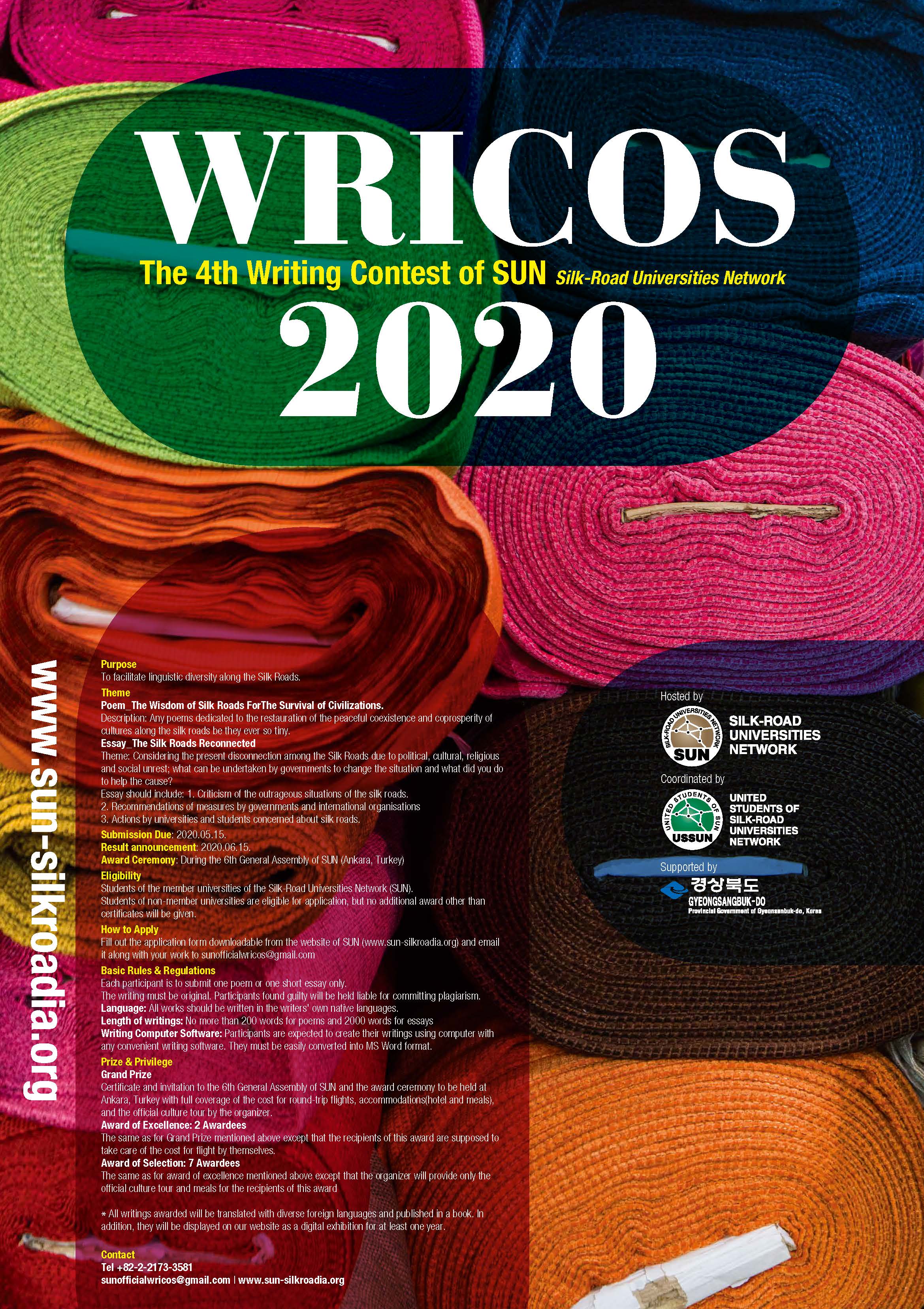 شبکه دانشگاههای راه ابریشم در راستای پویش تنوع زبانی در میان کشورهای عضو اتحادیه در نظر دارد مسابقه شعر و مقاله نویسی با موضوعات «خرد راه ابریشم برای حفظ تمدن ها» در بخش شعر و «پیوندی دوباره در راه ابریشم» در بخش مقاله نویسی را در بین دانشجویان دانشگاههای عضو شبکه، برگزار نماید. مهلت ارسال آثار 26 اردیبهشت 1399 می باشد. هر شرکت کننده می تواند تها 1 شعر یا 1 مقاله را به دبیرخانه همایش بفرستد. شعر یا مقاله باید به زبان اصلی صاحب اثر نوشته و ارسال شود. شعر حداکثر تا 200 کلمه و مقاله حداکثر تا 2000 کلمه می باشد. برای نفرات برتر این مسابقه اهدای گواهی نامه و و دعوت به حضور در مراسم گردهمایی سالانه در نظر گرفته شده است. برای شرکت در این رقابت لازم است شعر یا مقاله به همراه فرم ثبت نام تکمیل شده پیوست و به آدرس ایمیل زیر ارسال شود.